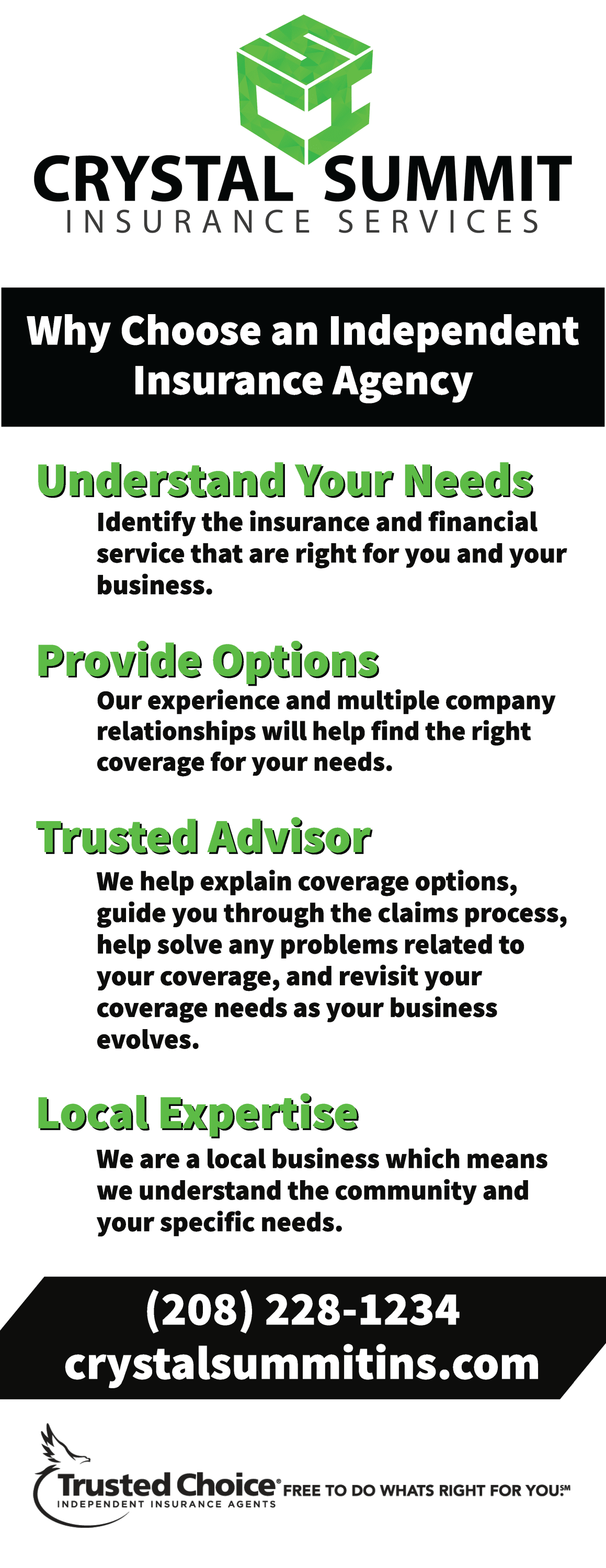 As an independent insurance agency we have the tools to find the right coverage at the right price to protect your business. Let us do the work for you, give us a call (208) 228-1234